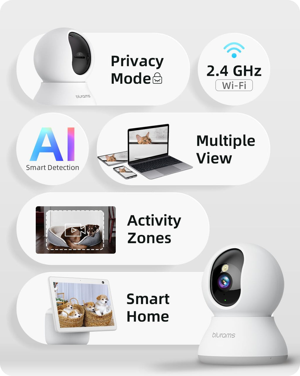 Enhanced blurams App - Live viewing 4 dog cameras simultaneously on App or official web portal. Share your camera with unlimited family members. Two-way audio allows you to receive and transmit audio from anywhere at any time