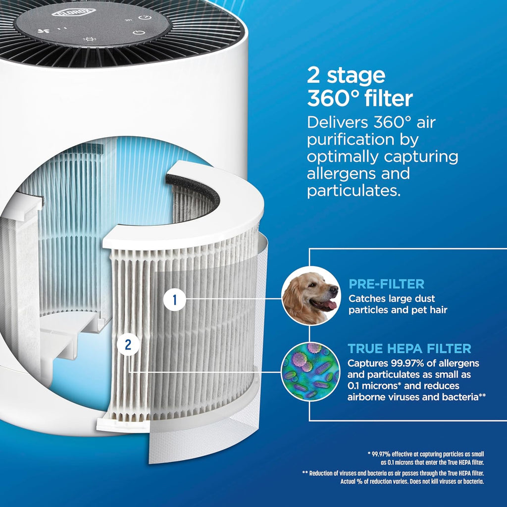2 STAGE 360° FILTER: Delivers 360° air purification by capturing allergens and particulates in 2 filter layers. The outside pre filter catches large dust particles and pet hair and the True HEPA filter captures 99.97% of allergens and particulates.