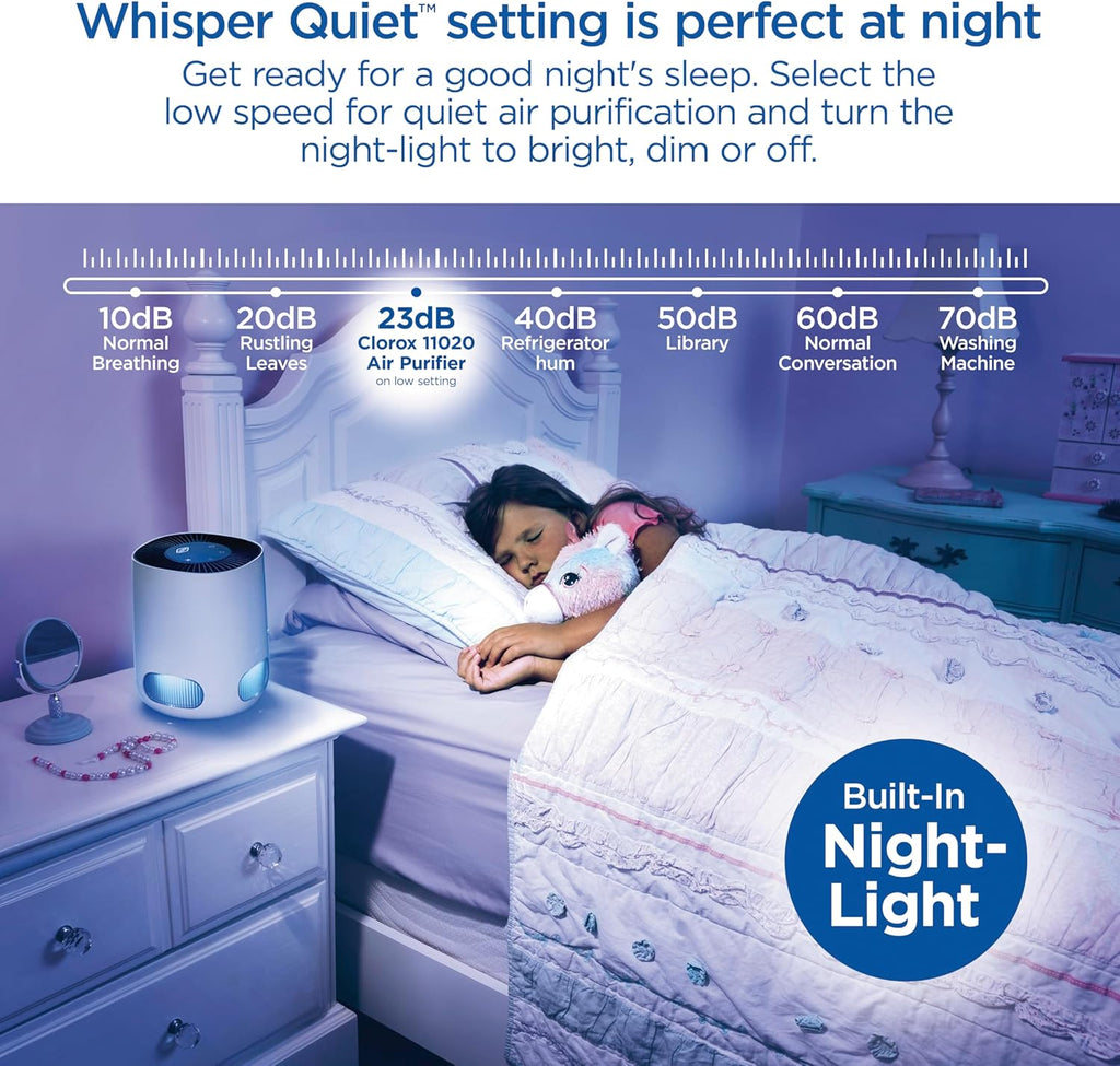 WHISPER QUIET SETTING IS PERFECT AT NIGHT. Get ready for a good night's sleep. Select the low speed for quiet air purification and turn the adjustable night light to bright, dim or off.