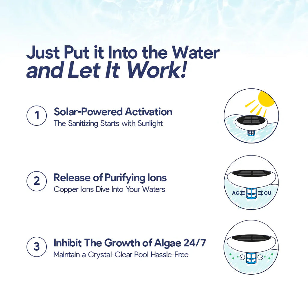 Low maintenance: Simply place it into the pool and let it work. The system continuously releases mineral ions that inhibit algae and bacteria growth.